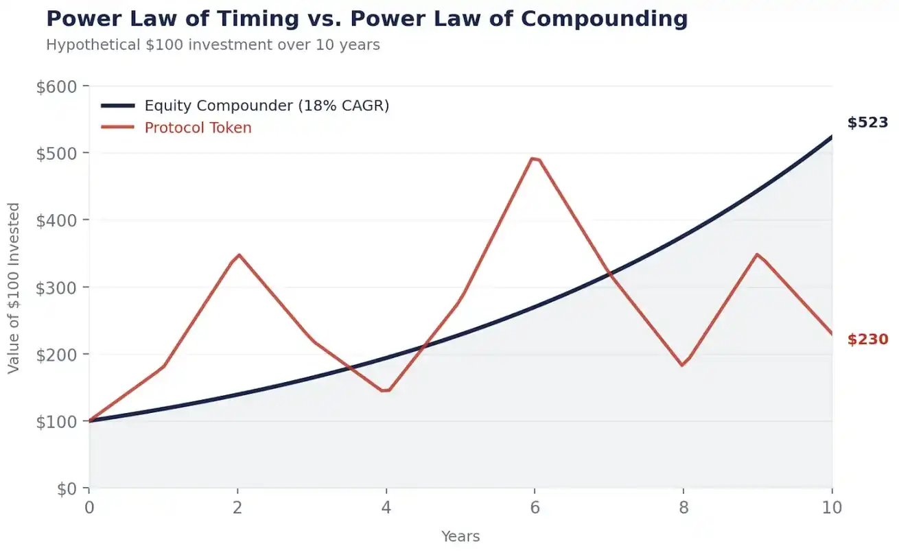หรือว่าผลประโยชน์สุดท้ายของทั้งสองอาจไม่ต่างกันมาก แต่การถือหุ้นทำให้คุณนอนหลับได้อย่างสบายใจทุกคืน ในขณะที่การถือโทเค็นต้องการให้คุณเป็นผู้ที่สามารถทำนายตลาดได้ล่วงหน้า "การถือระยะยาวดีกว่าการทำ Market Timing" ทุกคนเข้าใจหลักการนี้ แต่จุดยากอยู่ที่การทำให้เกิดความยึดมั่นในการถือครองจริง ๆ หุ้นทำให้การถือระยะยาวดูง่ายขึ้น: กระแสเงินสดช่วยยันราคาหุ้น การจ่ายเงินปันผลช่วยให้คุณรอคอยอย่างมีอดทน ซื้อคืนของจะประมูลต่อไปขณะที่คุณถือครอง แต่สำหรับตลาดสกุลเงินดิจิทัลการถือครองระยะยาวกลายเป็นเรื่องยากมาก: รายได้จากค่าธรรมเนียมอ่อนเพียงใด มีการเปลี่ยนแปลงสื่อ คุณไม่มีที่มั่นใด ๆ ไม่มีราคาสนับสนุน ไม่มีเงินปันผลที่คงทนเพียงแค่ความเชื่อเดียว